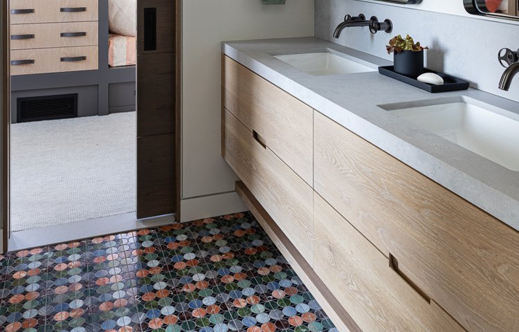 Two baths offer different styles in one project, smoothy transitioning from traditional to contemporary.