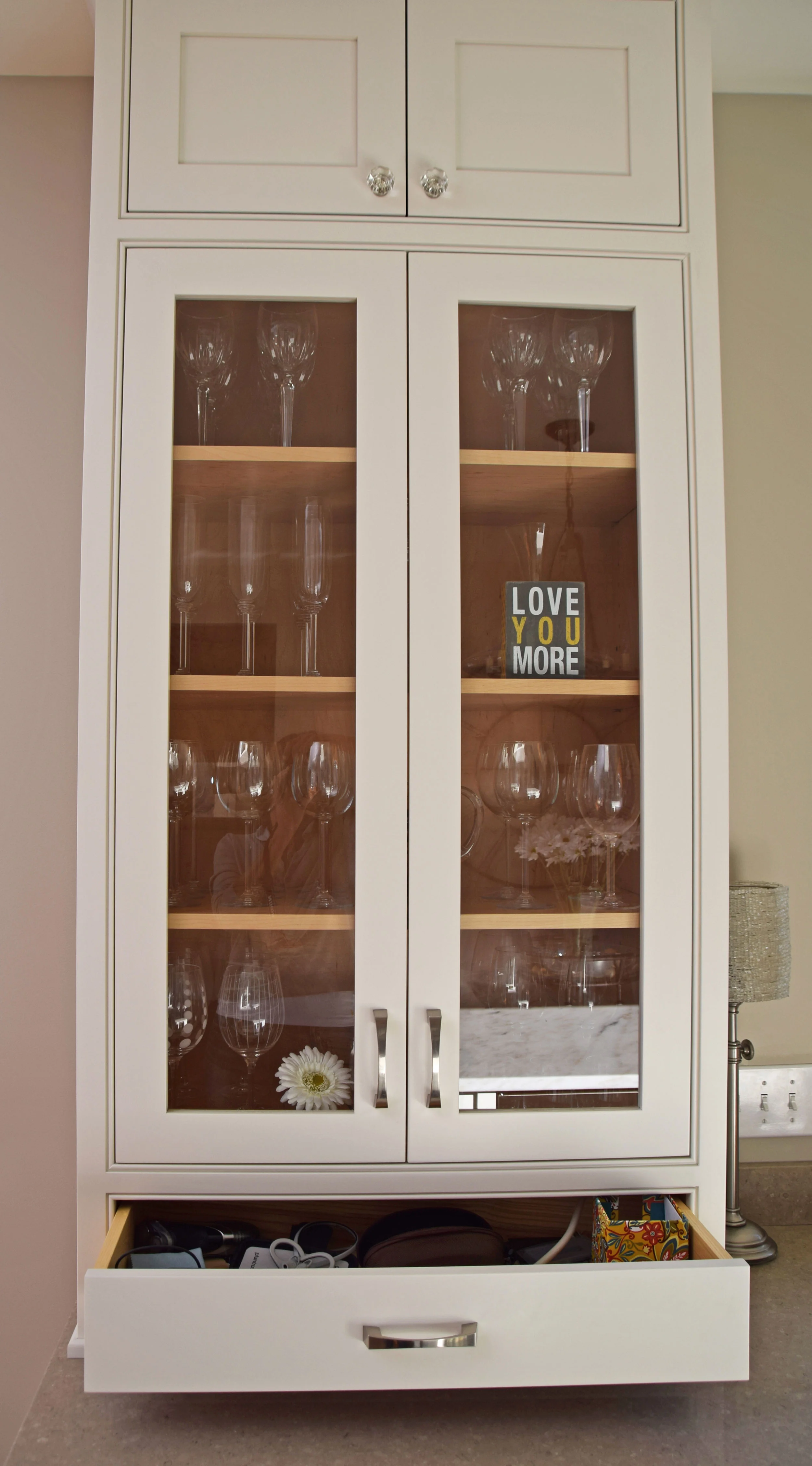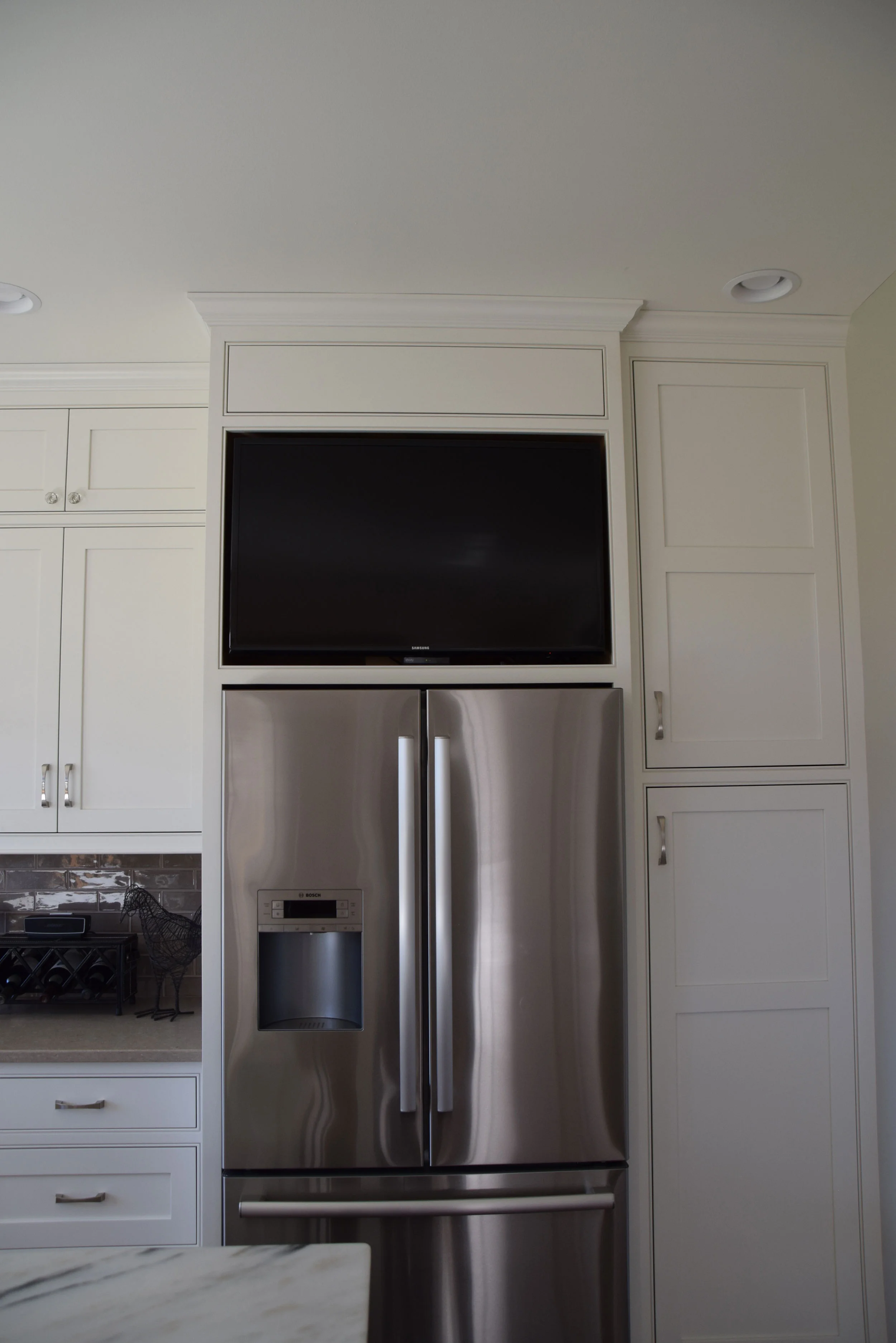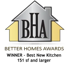 Named the “Best Kitchen” by the Home Builders and Remodelers Association at their Better Homes Awards program. This extremely beautiful and crisply clean white kitchen took home the gold in the “Best Kitchen 150 sq ft and under” category. An elegant kitchen enhanced with special features making it as functional as it is beautiful. Details include: drawer customizations for silverware, knives, and tools; full extension drawers for organizing pots and pans; an appliance garage; built-in Television maximizes hard to reach over the fridge space, and a gorgeous glass china cabinet.
